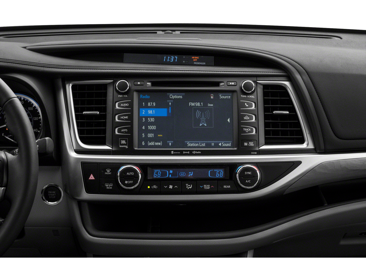 - Radio: Entune Premium JBL Audio w/Nav & App Suite -inc: the Entune Multimedia Bundle (8" high resolution touch-screen w/split screen display, AM/FM CD player, MP3/WMA playback capability, 12 JBL GreenEdge speakers, auxiliary audio jack, USB 2.0 port w/iPod connectivity and control, advanced voice recognition, hands-free phone capability, phone book access and music streaming via Bluetooth wireless technology), Siri Eyes Free, Entune App Suite, Intelligent Touch controls, SiriusXM Satellite Radio w/3-month complimentary SiriusXM All Access trial, HD Radio, HD Radio predictive traffic and Doppler weather overlay, AM/FM cache radio, Gracenotes album cover art and integrated backup camera display w/dynamic gridlines